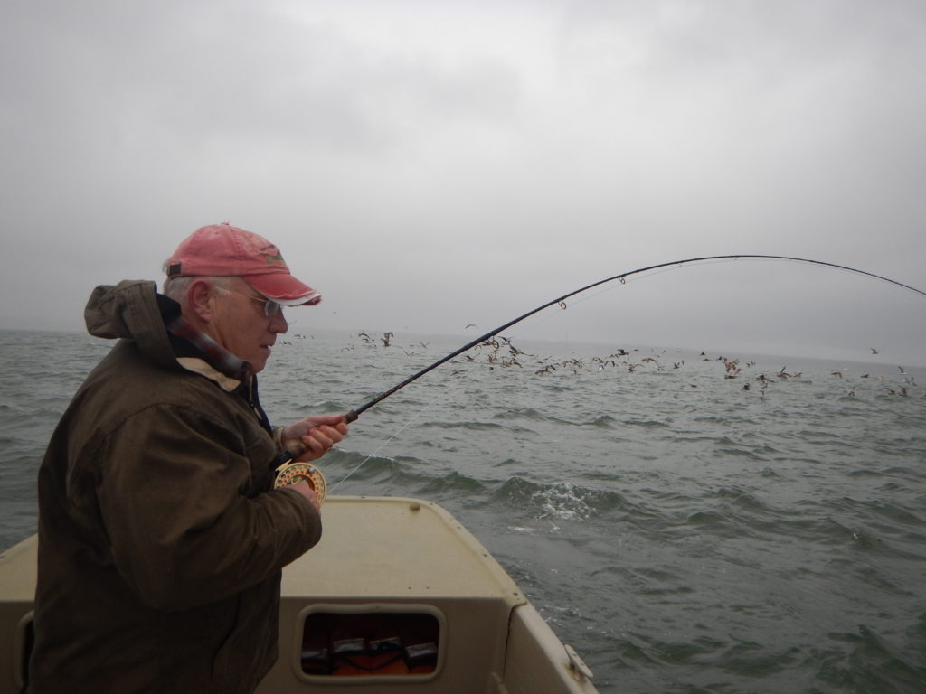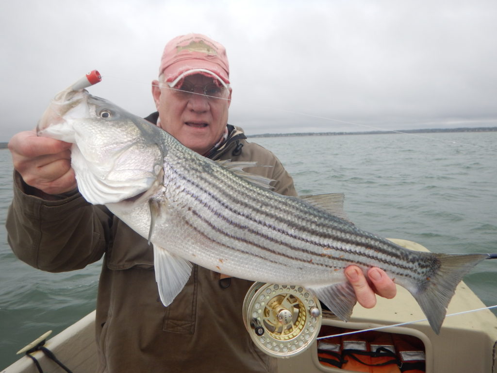 On board today, client and good friend, Richard Comstock of NYC, for fly fishing striped bass. At first light, raw, choppy and rain on and off. We picked our way out to where we found fish Wednesday, and they were there. No as many as Wednesday morning and not as many as Thursday afternoon, but plenty to keep us busy!