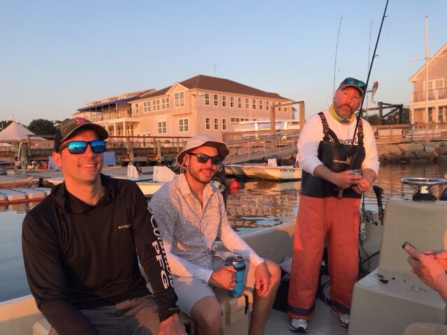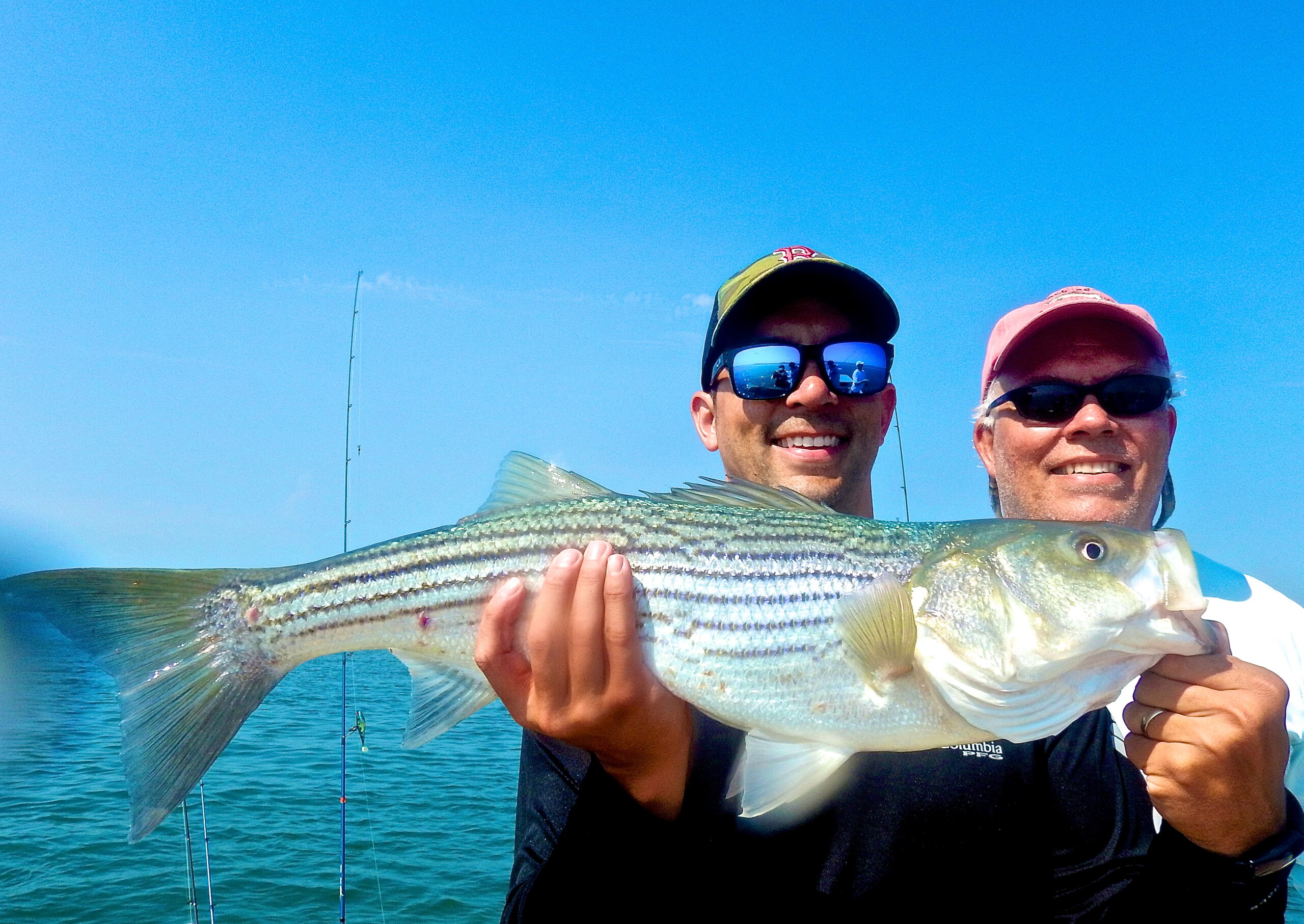 On board today, regulars Frank Harrington and sons Brian and Frank IV, and Ken Hartshorn, for light tackle striped bass. This great crew has been fishing with me for many years.