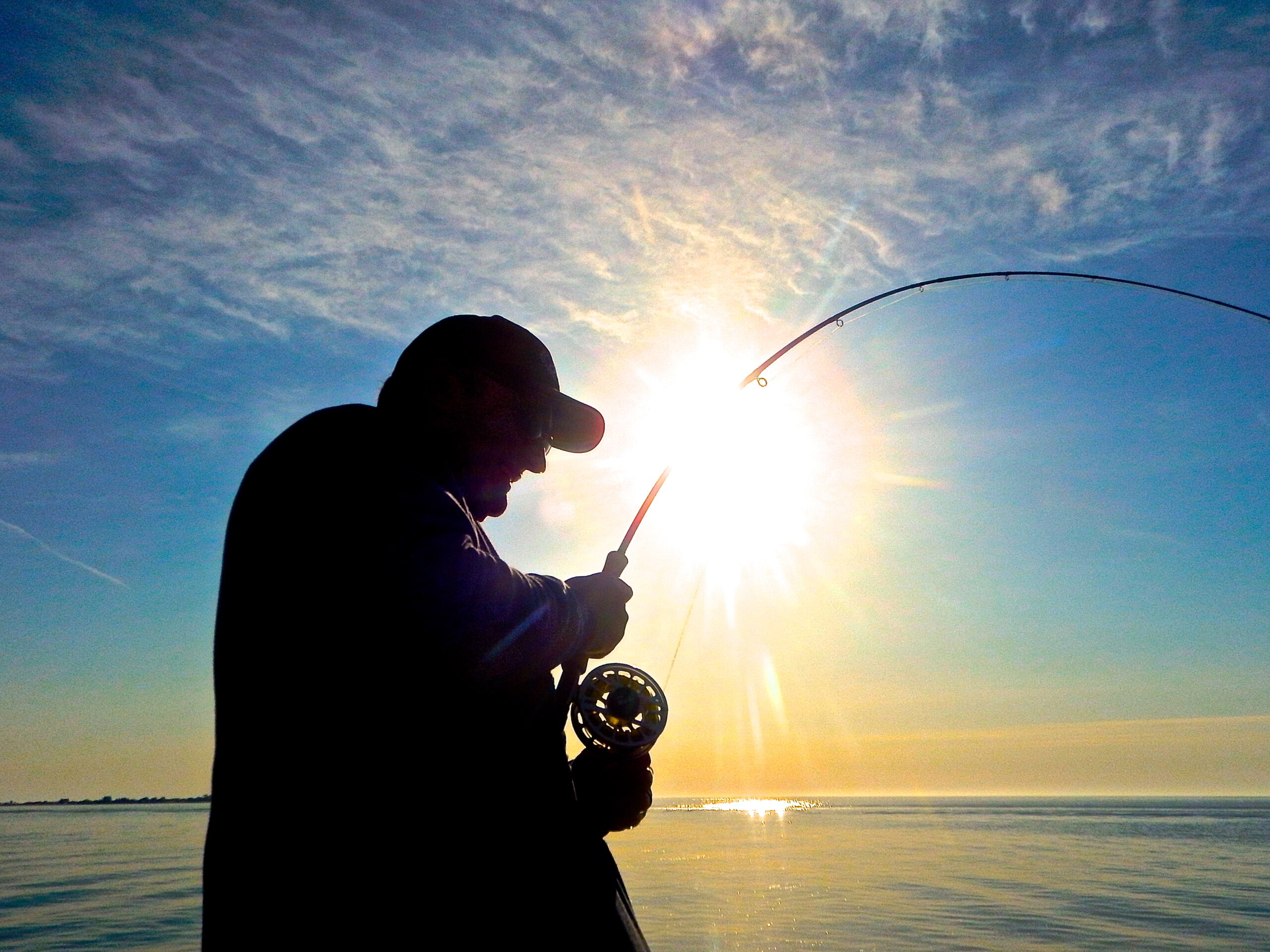 At first light – flat calm seas. What a change from yesterday’s chop. And the bay stayed flat all morning. Just a breath of East wind. Lots of fish back in the bay today on topwater chasing bait under birds. The flats were busy. No big schools of fish and no big fish inside today. But what was there was just great fun on the fly rod and light tackle gear.