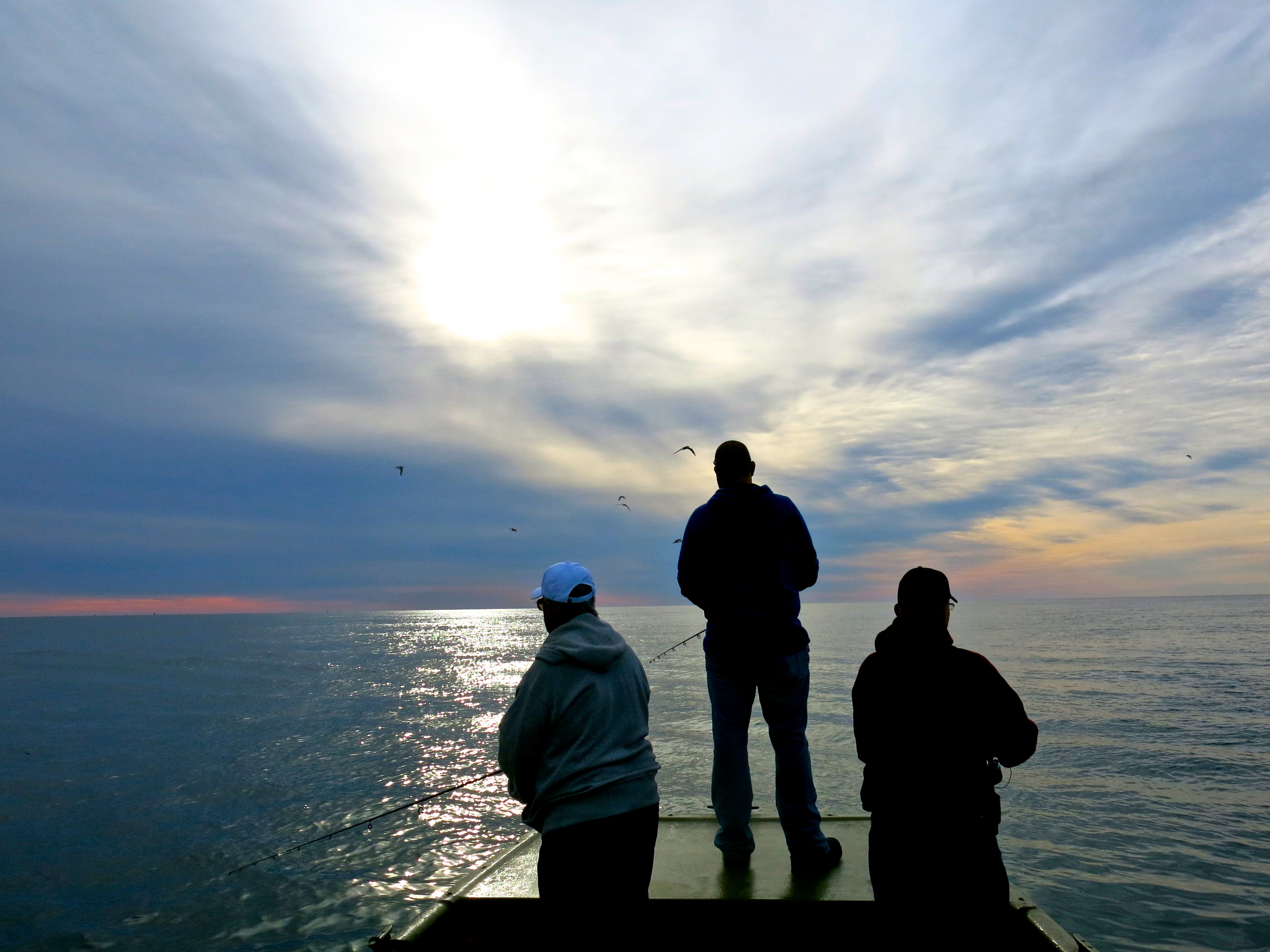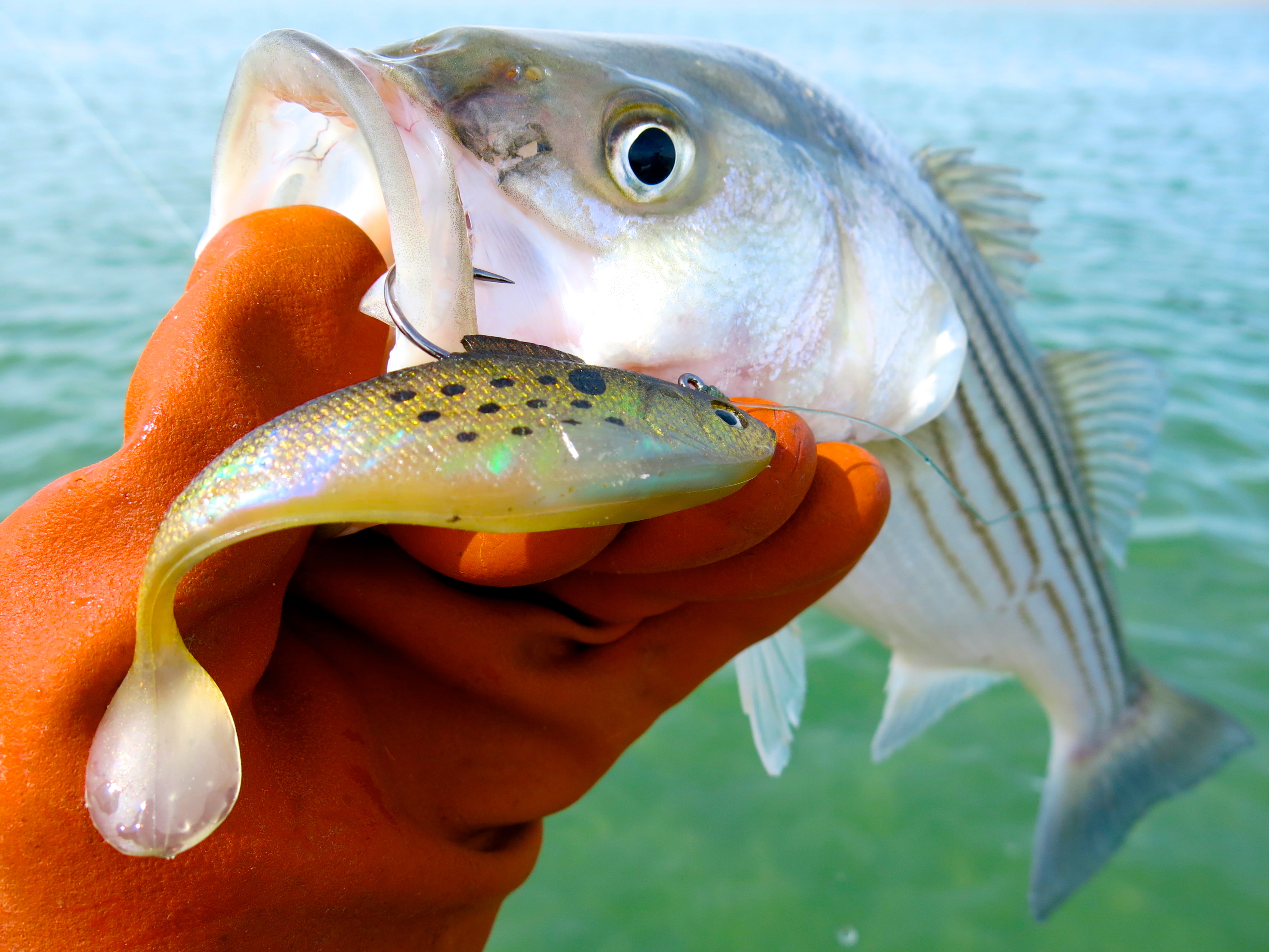 At first light, the bay was a sheet of glass and dead calm. And it stayed that way all morning. Just beautiful. Our first stop yielded a handful of short bass on rubber cranks and Capt. Dave’s Baymen Jig. Second stop of the morning and were into a nice spring blitz of bass busting bait on the surface with lots of gulls working overhead. We set numerous drifts on the glassy bay and got into a bunch of fish.
