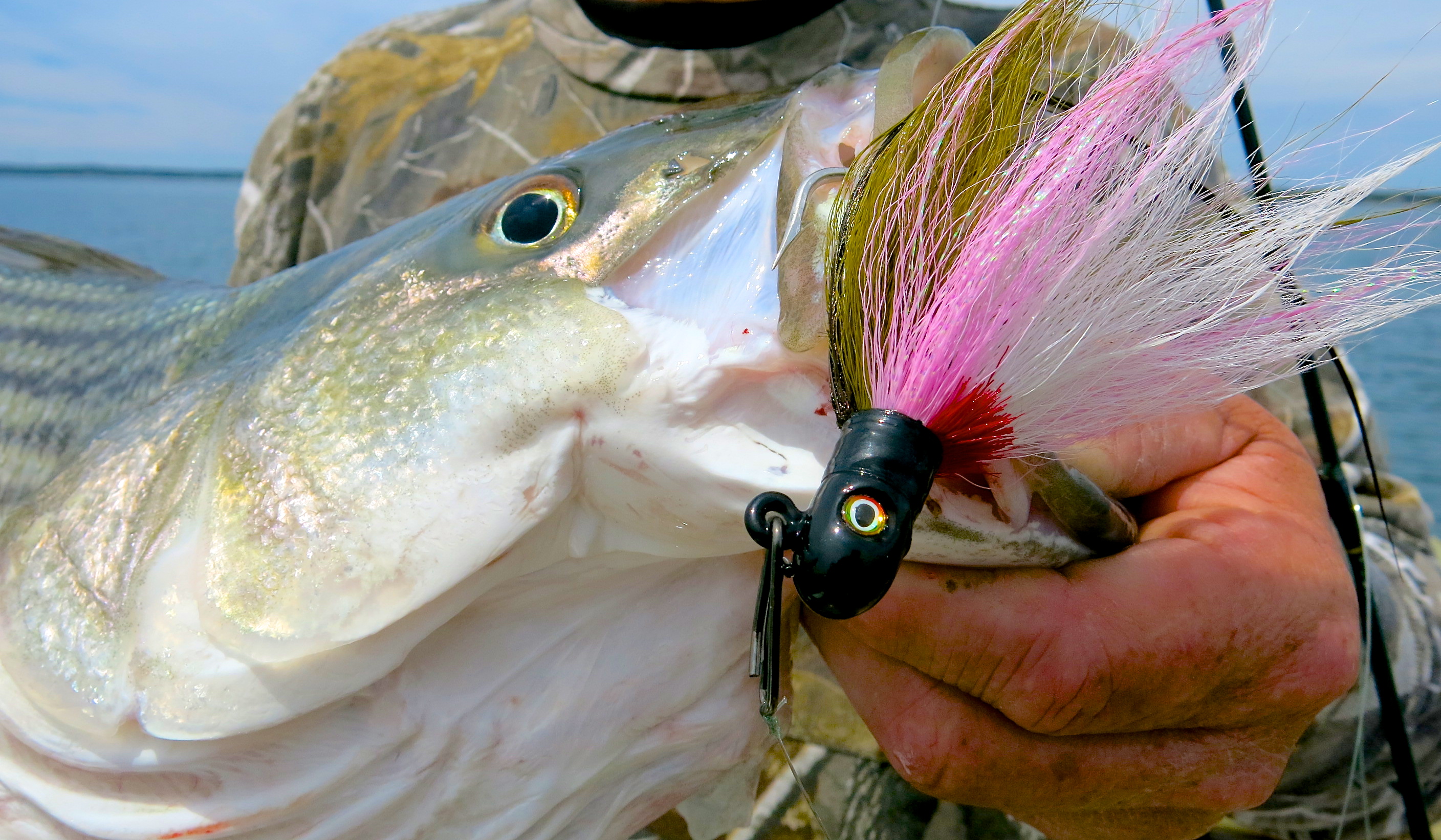 As the tide started to top out, the bite shut down cold. No birds, no bait, no bass. It was dead. But still flat calm and you could see a dimple a half-mile away. I decided to cruise slowly over some deep channels in the hopes of marking some fish. No luck. All bass and bait had left the bay – except for one small pod that popped up for five minutes. We saw them break the surface, motored over and immediately had multiple hook-ups, including a small keeper that slammed my Baymen Jig. Then the fish were gone. We searched for another half-hour but they never showed again.