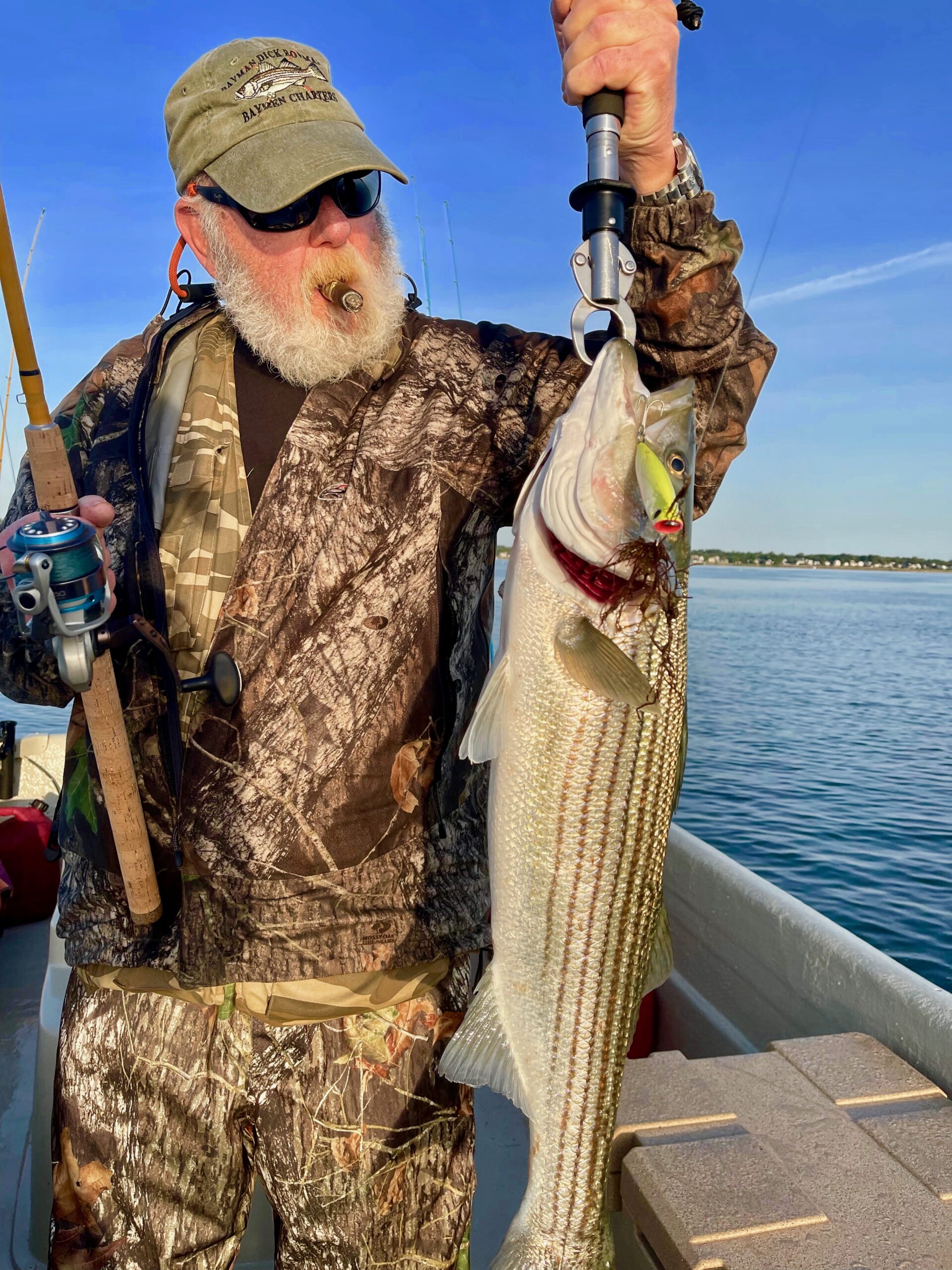 We fished a lot of depths today. 75 fow to 6 fow. The bass were moving following bait. It was not an all out spring blitz today. More like a small, contained blitz popping up here and there. Top lures were Hogy Charter poppers, Baymen Jigs, 3″ rubber crank baits, a rubber sluggo type bait from Anthony Lombardo at Bears Den Fly Shop, and a few other lures from Dick Bowman’s Tackle Box. You may think you have a lot of great tackle until you meet Baymen Dick Bowman!