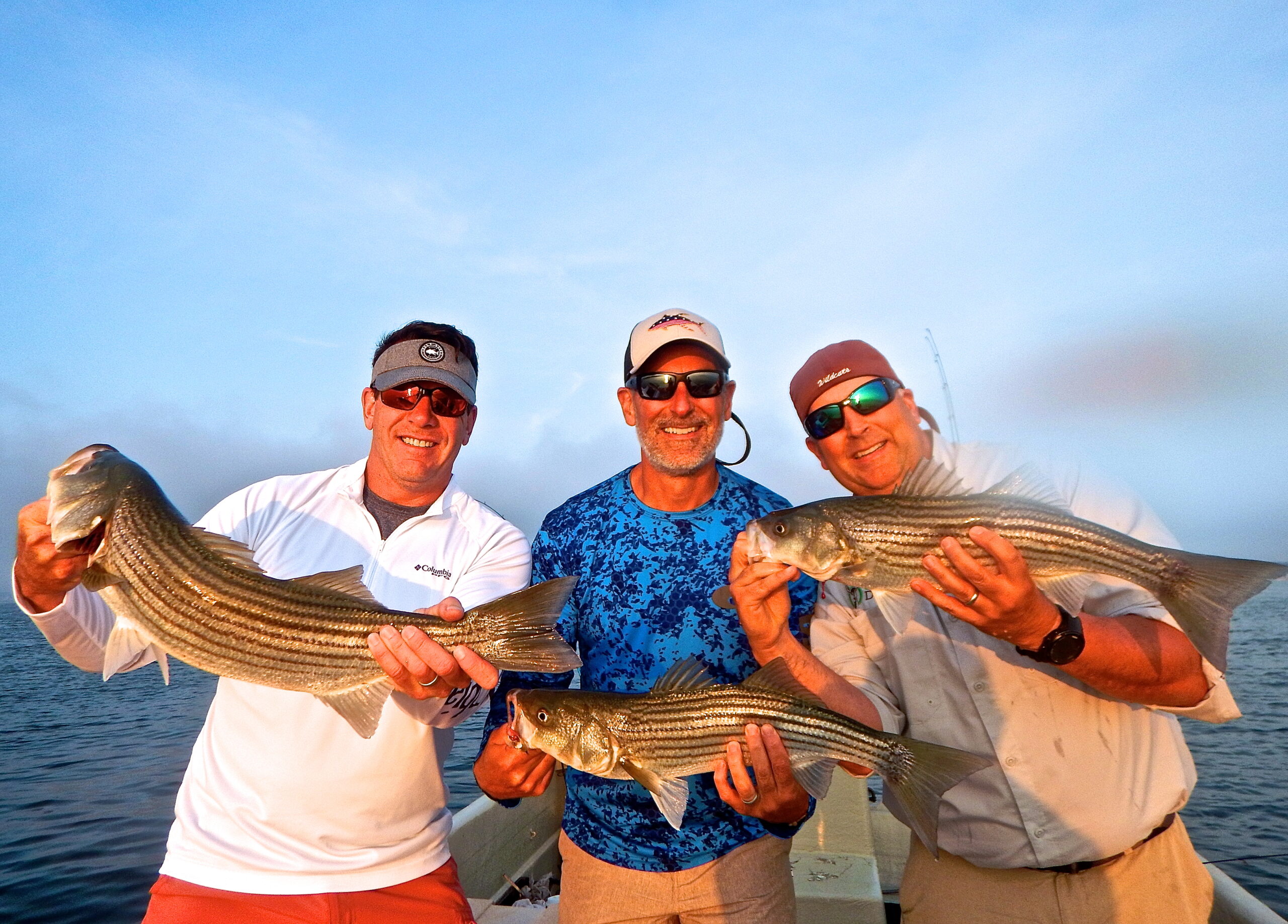 On board today, Kurt Upham, President/CEO of Oh, Deer with friends John and Dave for light tackle striped bass. At first light, low tide, S wind, and water temps 54-66. Light fog over the bay.