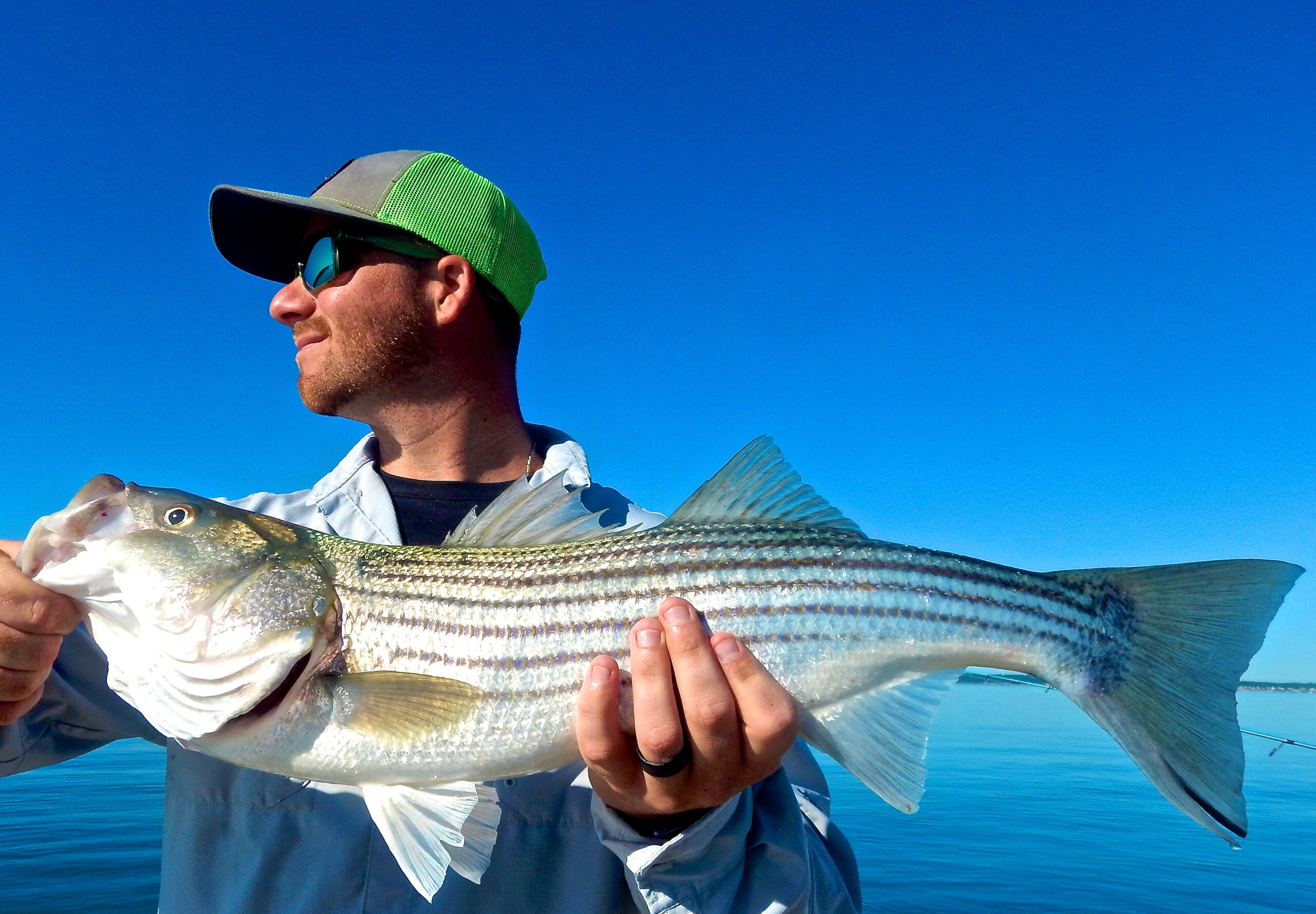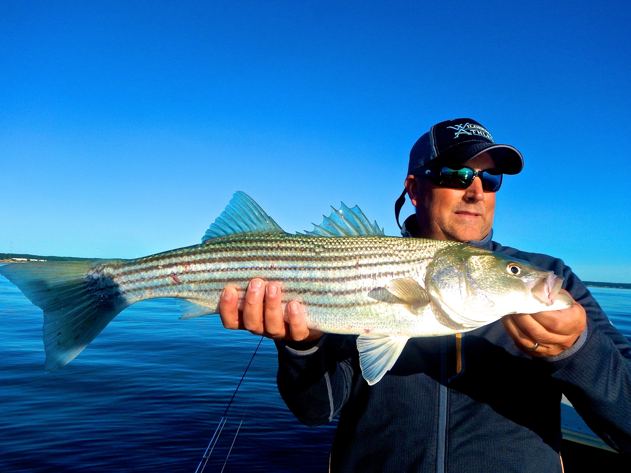 Moving back down towards Plymouth, we checked several spots along the way with no fish home. Then, we worked a shallow beach in 9 fow and had a great drift with the East wind and tide working together. We hooked into several more fish and even had a couple of seals join us. We reset the drift several times and landed fish. From there, we ran back into Duxbury and landed one last fish to wrap up the morning.