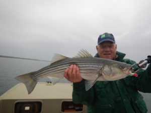 The best bass of the morning was a fourteen-pound striper that taped out at 34 inches. Our second best fish was a nine pounder that taped out at 29 inches. The third best fish of the morning popped the hook at the boat while yours truly was trying to Boga-Grip it. That fish was about 30 inches and around twelve pounds.