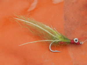 Right from the start, we were into schools of striped bass. They were small fish, lots and lots of micros of 14″ inches and up, with a few big fish feeding right along with them. Richard is an all fly or die angler, and we fished topwater poppers, Baymen Universals, olive/white clouser, a streamer, and perhaps our best fly pattern of the day: “the ugly fly” which really wasn’t that ugly. It was a pattern that Richard tied when he first got into tying, but he never fished it. “Too ugly.” Well, today it was our top producer and landed most of our fish (see photo).